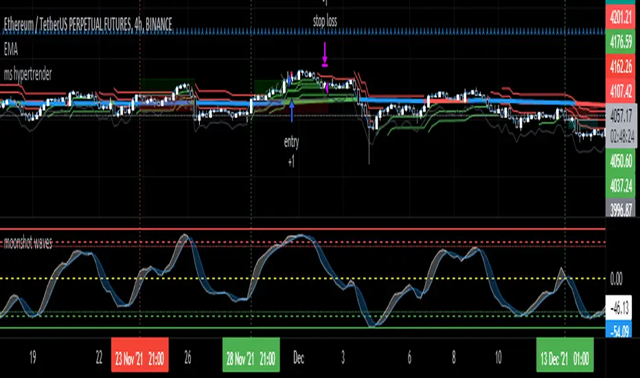 the idea is to have at least 2 super trends going green above the trend-EMA to go long and exit by turning