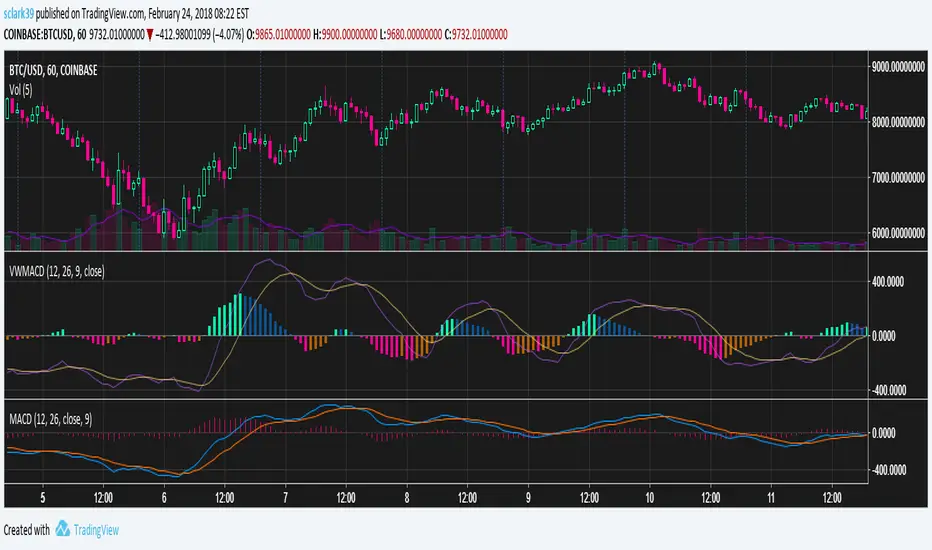 MACD built out of two Volume Weighted Moving Average (VWMA) lines of different periods. The signal line is still an EMA of the MACD line, just like with the normal MACD .