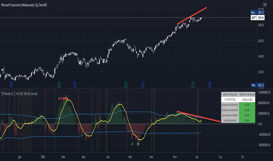 The main graph is a histogram. Green bars mean an inflow of volume, red bars mean an outflow. When the red volume crosses the baseline zero, it is considered a buy signal (in the classic TSV version). A similar sell signal - just the opposite. I highlight them with a colored background fill.