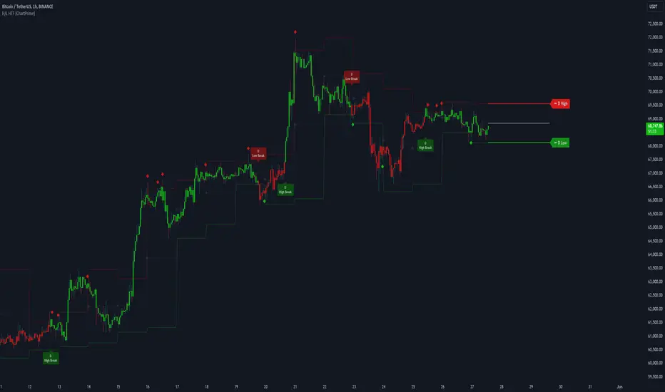 - Breakout Conditions: Determines if the current price has crossed above the higher timeframe high (high break) or below the higher timeframe low (low break).