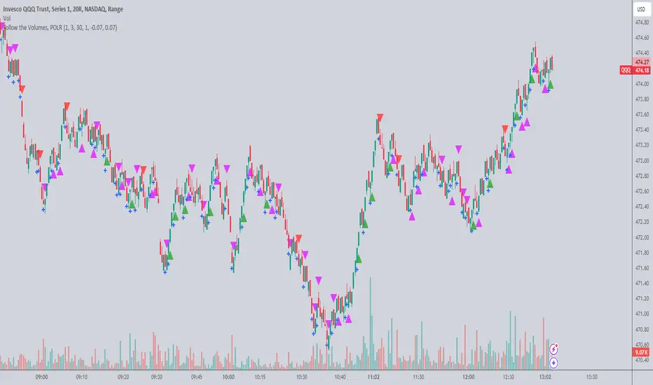 3. Price change within thresholds: A fuschia triangle appears, pointing up or down based on the overall (short-term) trend. This is common behavior during trends. A spike in volume will appear, and price simply does not budge. Volume/price is essentially declaring a new found value, in which case prices tend to follow the impulse movement (see market profile theory).