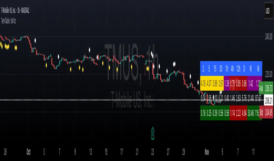 * Dynamic Table: A table is dynamically updated with data for each enabled timeframe, allowing traders to quickly compare volume data across different periods.