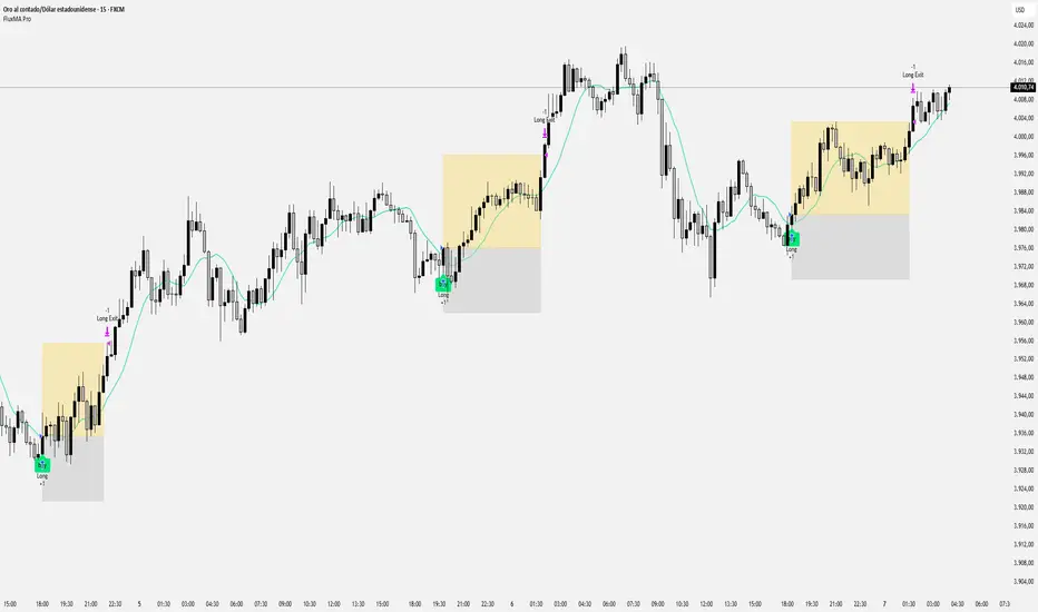 FluxMA Pro is an intraday trend-following strategy based on moving-average cross signals, with built-in execution filters (time window + weekdays), direction control, and an optional strict one-trade-per-day rule.