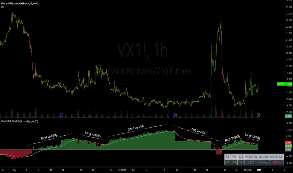 I look for short volatility positions (SVIX) when the roll yield is rising. I look for long volatility positions (VXX, UVXY, UVIX) when the roll yield begins falling. The indicator can be added to any chart. I suggest using the VX1, SPY, VIX, or other major stock index.