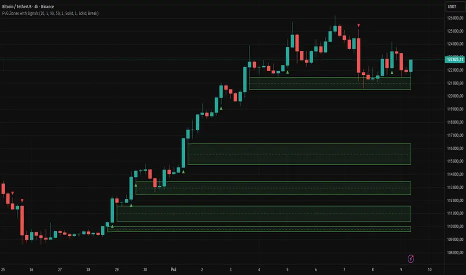 "FVG Zones with Signals" is a technical analysis tool that identifies Fair Value Gaps (FVG) on the chart and draws customizable zones in the form of boxes. It is ideal for traders using price action and market structure strategies, helping to identify potential imbalance zones and trading opportunities based on breakout and exit signals. With flexible size filter settings, box styles, and signal options, the indicator ensures clarity and precision on the chart.