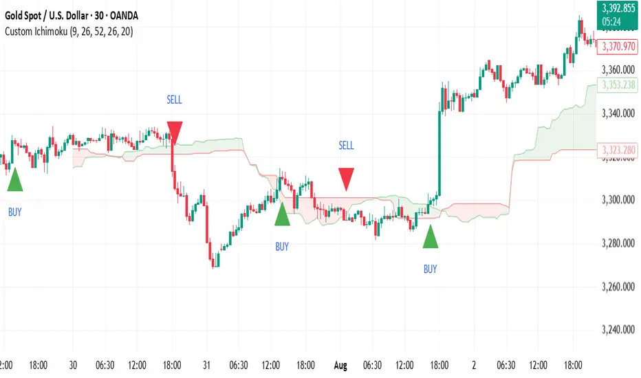 This indicator generates trading signals based on Ichimoku Cloud breakouts and breakdowns. It identifies when price decisively moves through the cloud boundaries, filtering out false signals from consolidation periods.