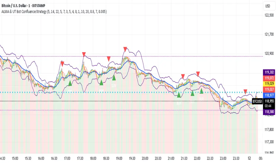 This is a comprehensive trend-following and momentum strategy designed to identify high-probability trade setups by combining multiple layers of confirmation. It is built around an ALMA (Arnaud Legoux Moving Average) and a long-term EMA, and then enhances signal quality with the popular UT Bot indicator, a Volume Filter, and an adaptive hold mechanism.