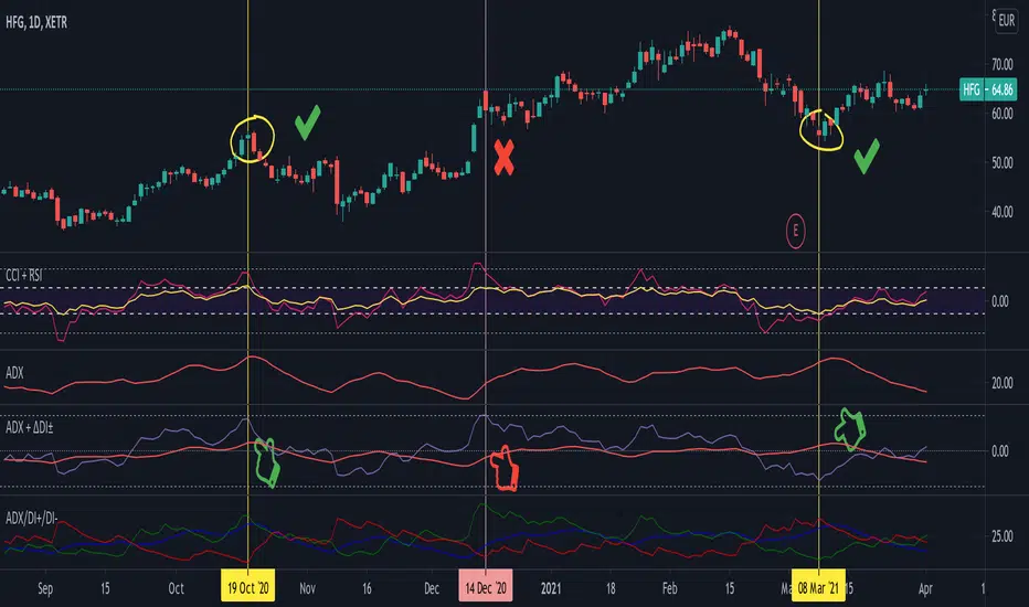 When you look at the graph, low Delta values seem to be good entry points for LONG positions, high Delta values good exits. This is similar to how RSI and CCI work, which is why included them in the chart above (tradingview.com/script/9EX6Tyup-Commodity-Channel-Index-Relative-Strength-Index-Same-Scale/). However, this is only reliable, when the ADX is above 25, or 0 in this version, indicating the symbol is in "trend mode". This is important.