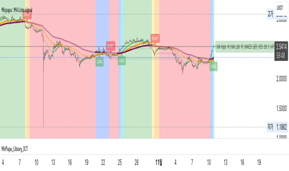 “MirPapa : MA Lists Signal” is an indicator that visualizes multiple moving averages (MAs) and trend-based background signals.It supports various MA types (SMA, EMA, WMA, etc.) and color-codes each MA (Lowest → Base) by direction.