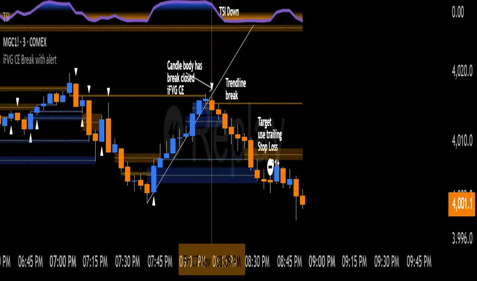 - Entry arrows (iFVG): plots an arrow when the candle body breaks & closes across a stored CE, both up and down.
