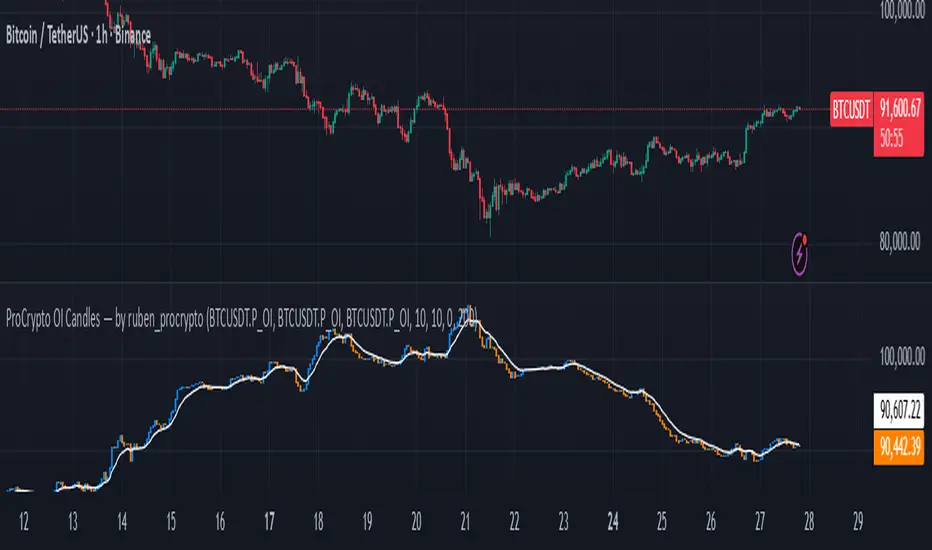 It plots OI as colored candles (blue for increasing OI, orange for decreasing OI), combined with a smoothed OI line for clearer trend reading.