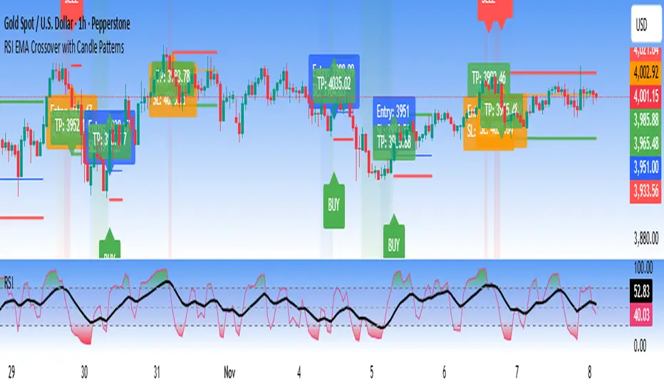 This script identifies entries when the RSI crosses a key threshold and aligns with an RSI - EMA crossover, confirming Exhaustion of a current trend and Price action confirms the Change in Trend direction. It integrates price action filters to avoid false signals during low-volatility or choppy conditions.