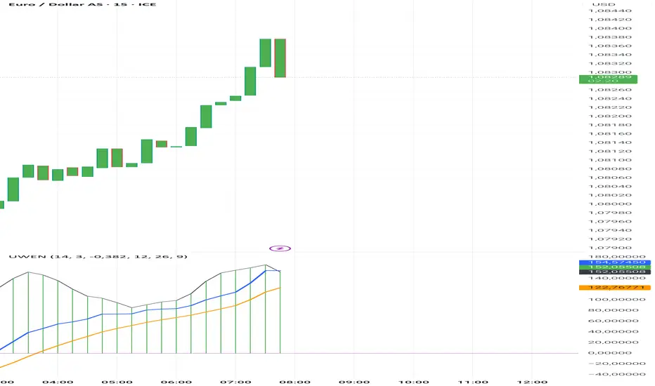 This Pine Script defines a trading indicator called "Uwen FX: UWEN Strategy" Where ideas coming from Arab Syaukani and modified by Fiki Hafana. It combines a CCI-based T3 Smoothed Indicator with a MACD overlay. Here's a breakdown of what it does: