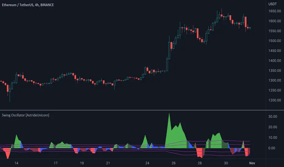 When the indicator is above the zero level and colored green, it means that the price is in an upward swing. When the indicator is below the zero level and colored red, the price is in a downward swing. When the indicator is blue, the price swing is slowing down or the market is moving sideways. The amplitude of the oscillator shows the price volatility.