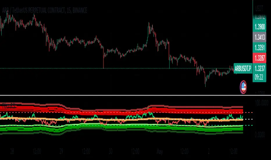 ***The parameters in the code can be adjusted for calculation, including the price type used, the RSI period, the Moving Average period for BB, and the standard deviation count for BB. After this, the current position of the RSI, Moving Average, and standard deviation for BB are calculated. After calculating the upper and lower BB, the levels above and below the average are calculated using a specific dispersion constant.