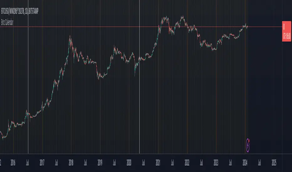 Updated this calendar script to include Bitcoin halving dates. Some halving dates will not show in weekly time frame - no problems from daily or lower time frames.