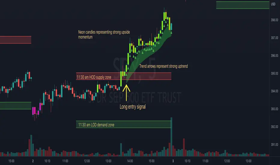 2. If the stock breaks above the HOD and the ADX is showing strong momentum to upside then the candlesticks will start showing neon color, if the trend based on moving averages and candle closing is also bullish then the indicator will show trend arrows under the candle indicating to stay in the trade. Same applies for break below LOD, only the colors will change to represent downtrend.