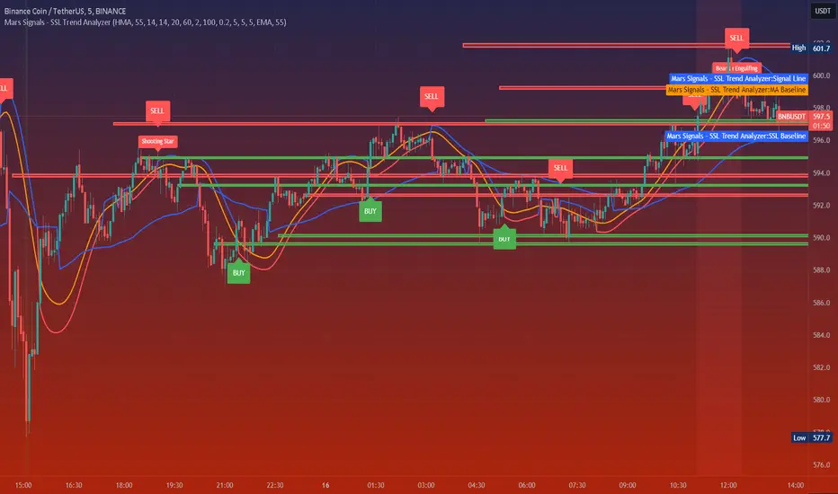 The "Mars Signals - Precision Trend Analyzer with SSL Baseline & Price Action Zones" is a comprehensive technical analysis tool designed for traders seeking to enhance their market analysis and trading strategies. This indicator integrates multiple advanced trading concepts, including dynamic moving averages, trend detection algorithms, momentum indicators, volume analysis, higher timeframe confirmation, candlestick pattern recognition, and precise price action zones. By combining these elements, the indicator aims to provide clear and actionable buy and sell signals, helping traders to make informed decisions in various market conditions.