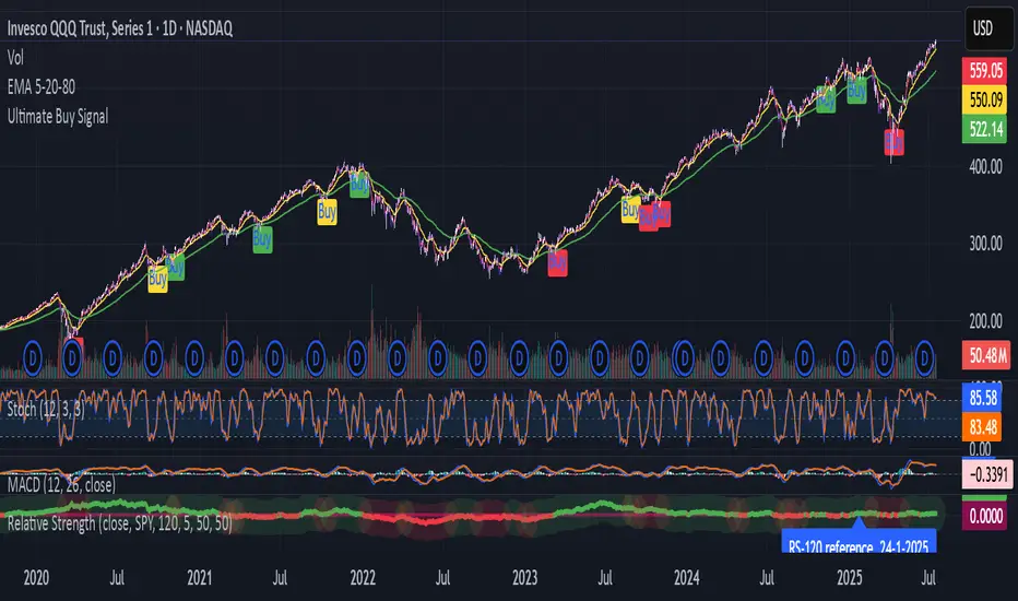 Ultimate Buy Signal is a multi-factor momentum-based indicator designed to identify high-probability long entries by combining market breadth, trend confirmation, and relative strength. This tool aims to help traders spot optimal buy zones with improved timing and context.📊 Core Components: