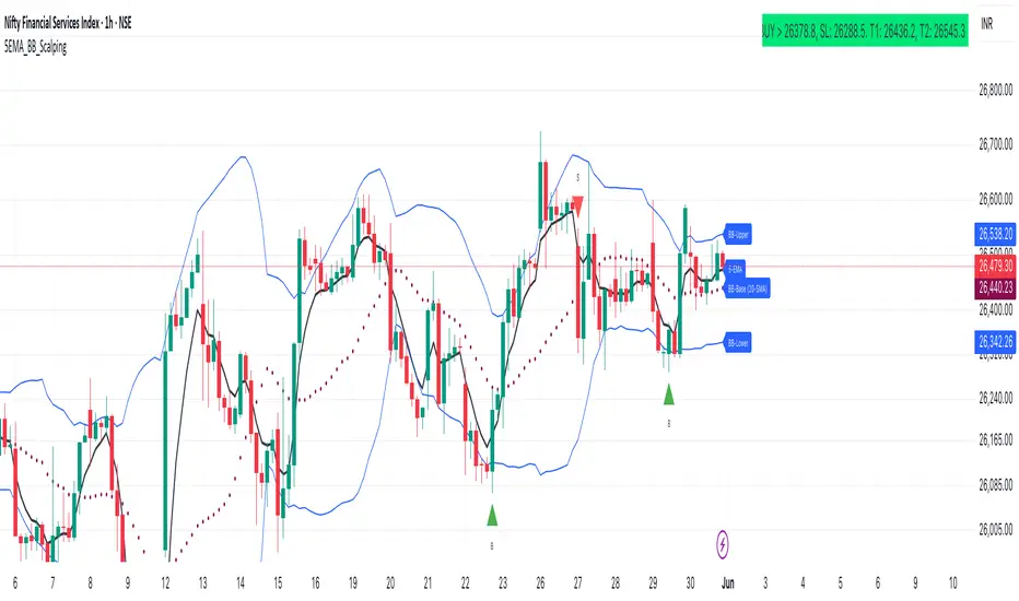 Just opposite for selling. 5-EMA low should be above 5-EMA and closing should be inside BB (lesser than BB higher level). That's a Sell signal. SL: high of the candle, T: middle and lower BB.