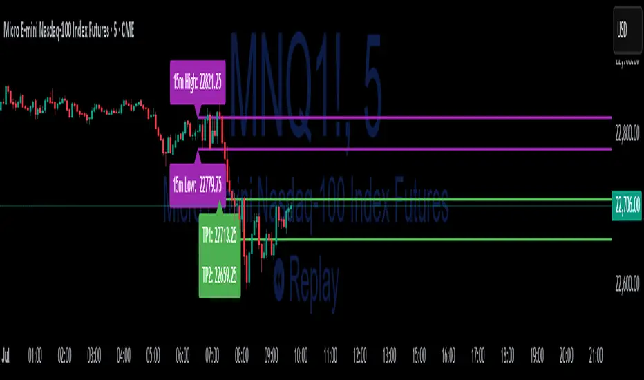 - Upon a breakout, the script calculates the distance from the entry (breakout) to the opposite side of the 15-min range and uses your input multipliers to project two take-profit levels (TP1/TP2).