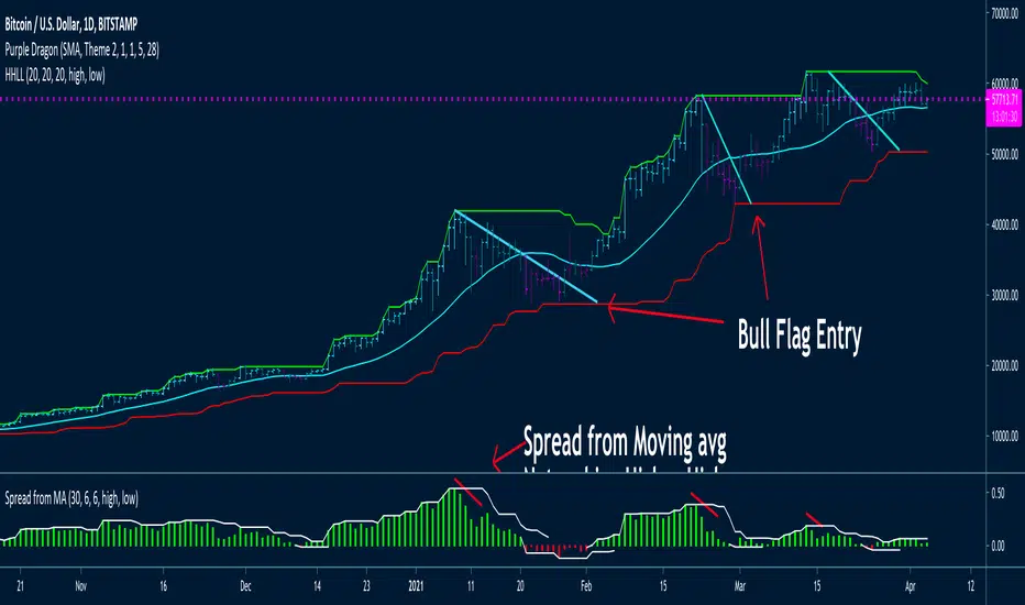 Spread from Moving average indicator is available under my other scripts -- seems to indicate when price momentum is starting to stall by price not moving further away from the moving average. That would indicate good points to take profits, as price will likely do a mean reversion 😭