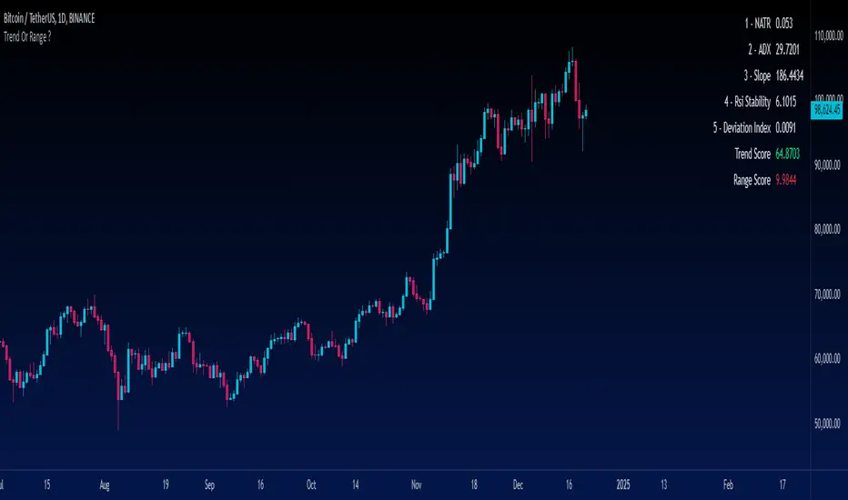 Are you uncertain whether the market is trending or stuck in a range? The "Trend or Range?" indicator is here to eliminate the guesswork by providing a structured, data-driven analysis of market conditions.
