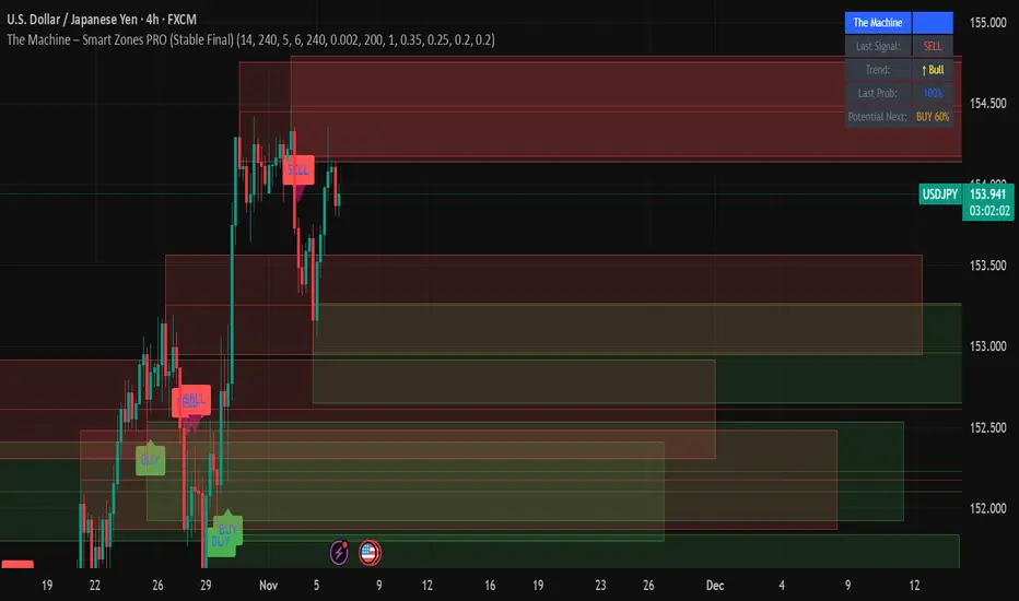 The Machine – Smart Zones PRO is a multi-component analytical indicator that identifies key market structure zones, trend alignments, and potential confluence areas using a weighted probability model. It’s designed to map price behavior around support and resistance pivots while integrating higher-timeframe trend and volatility data for confirmation.