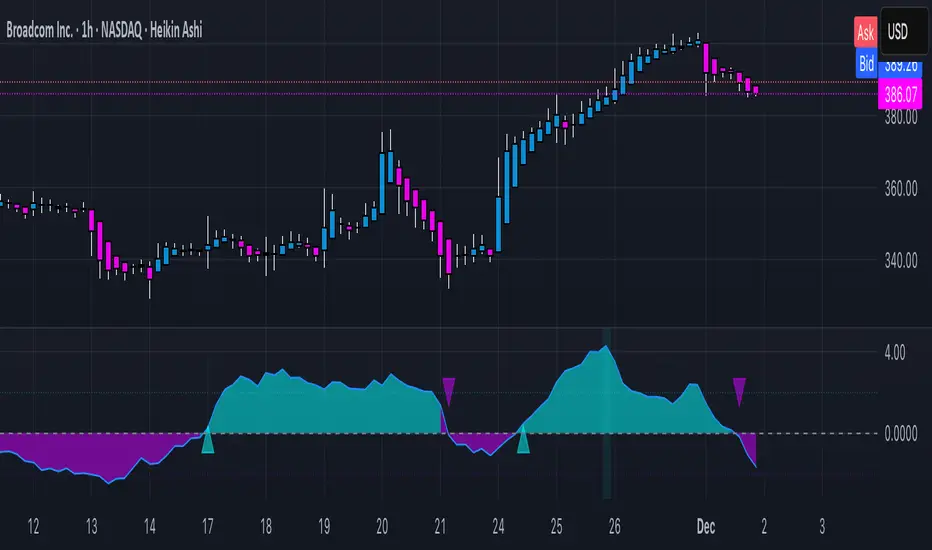 - Divergence (not plotted here, but easy to spot visually): price making new highs while the aqua area is shrinking → distribution. Price making new lows while the purple area is shrinking → hidden buying and coming reversal.