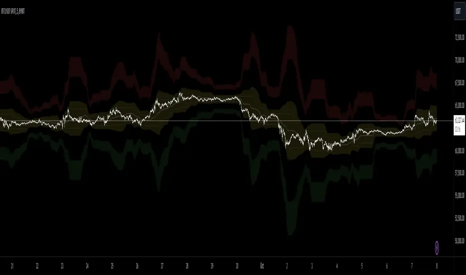 Visual Enhancements: The indicator features filled regions between bands to clearly visualize the zones of price movement. The fills between the bands offer insight into potential support and resistance zones, based on price levels defined by the Fibonacci ratios.