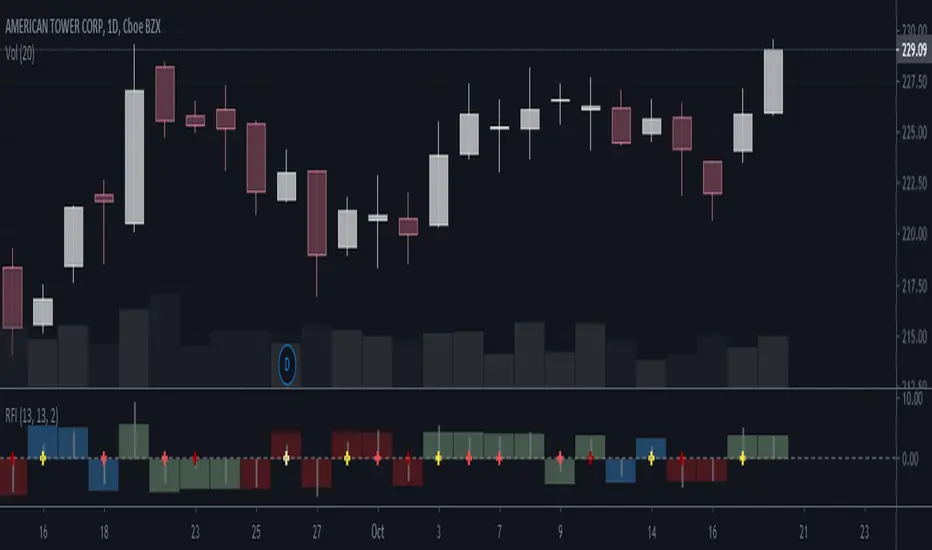 -- Can be used to determine stops and targets (Example: Stop loss at prev close - ATR, Target at 2x ATR) - [Force] Index - Alexander Elder's EMA of (change(close) * volume), shows crosses above 0 (green) and below 0 (red), and intermediate signals