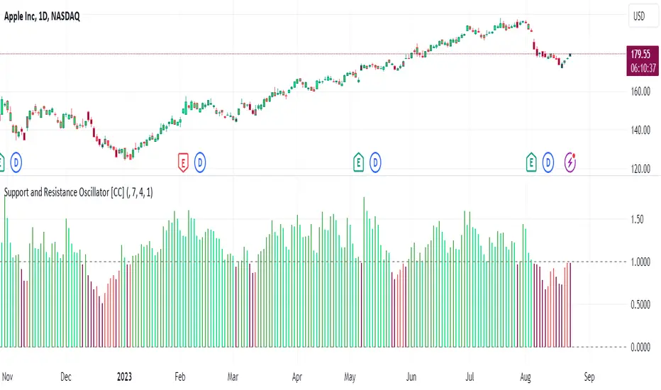 The Support and Resistance Oscillator is an experimental script I created to identify when the current price breaks a support or resistance line and reflect this value in an oscillator formula. This indicator uses a threshold to decide the dividing line between buying and selling points. Feel free to change the threshold or smoothing settings to see if you find anything better since this is so experimental. I'm double smoothing the difference between the indicator and its signal line to attempt to capture a combo of the price momentum combined with the general support and resistance levels. I have used dark colors for strong signals and lighter colors for normal signals and make sure to buy when the line turns green and sell when it turns red.