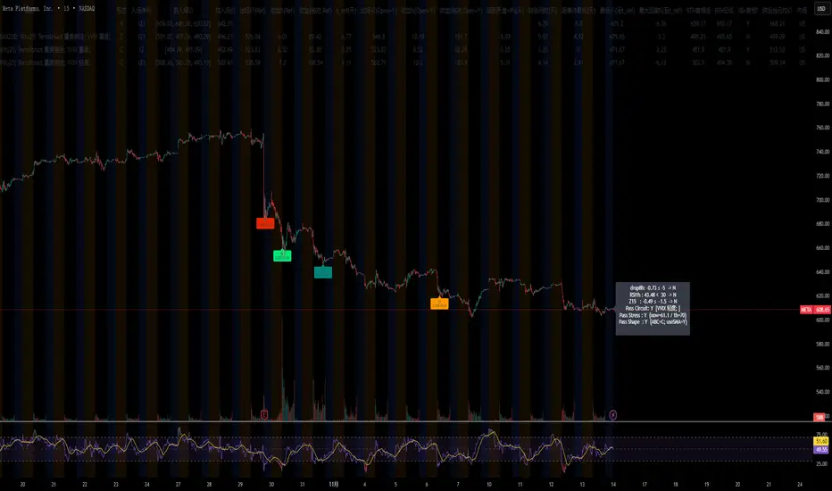 * When a valid oversold event appears, simulate staged entries (E1/E2/E3) and exits, then record everything into a historical table and JSON for external analysis.