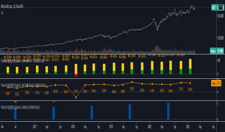 This indicator plot basic key financial data to imitate the presentation format of several popular finance site, make it easier for a quick glance of overall company financial health without switching tabs for every single stocks.