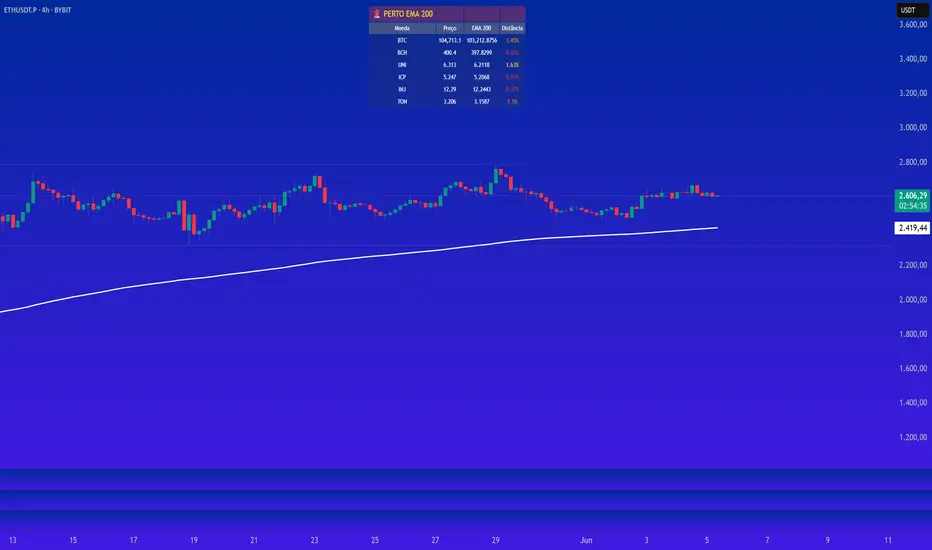 The EMA 200 Monitor - Bybit Coins is an advanced indicator that automatically monitors 30 of the top cryptocurrencies traded on Bybit, alerting you when they are close to the 200-period Exponential Moving Average on the 4-hour timeframe.