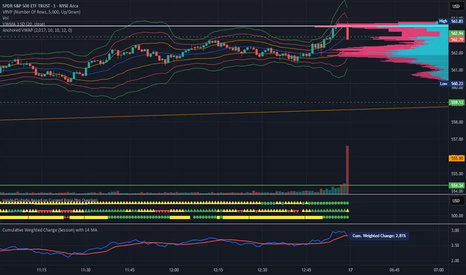 This indicator provides the session weighted cumulative change of the Magnificent 7(AAPL META GOOG AMZN MSFT NVDA TSLA), it is weighted according to their market capitalization and size in relation to size of the market. The bar to bar current change is plotted by the fast line that begins its calculations at the start of each daily session, the smoother(slower) line is the 14 period Volume Weighted Moving Average of the cumulative change.
