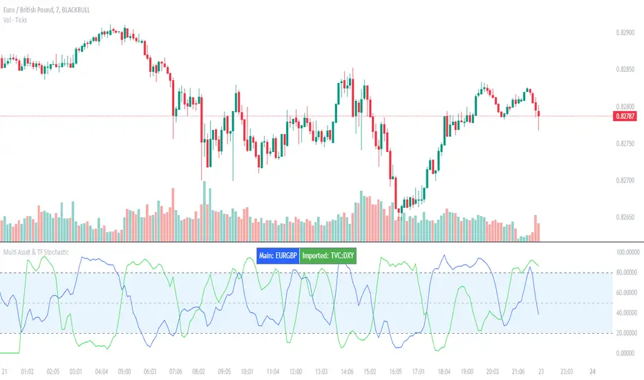 The indicator plots the %K and %D lines for the main asset in prominent colours. If the second asset is enabled, its %K and %D lines are also plotted in different colours. Additionally, overbought (80) and oversold (20) levels are marked, with a midline at 50, making it easier to gauge market conditions at a glance.