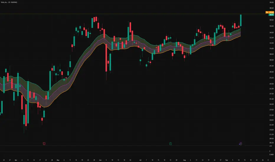 The indicator draws a “cloud” or channel by shading the area between the outermost two EMAs of the three. This lets you see a band or zone that the price is moving in, defined by those EMAs.