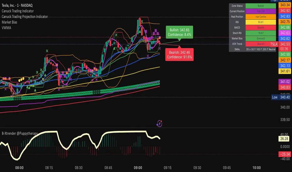 The Canuck Trading Projection Indicator is a powerful PineScript v6 tool designed for TradingView to project potential bullish and bearish price trajectories based on historical price and volume movements. It provides traders with actionable insights by estimating future price targets and assigning confidence levels to each outlook, helping to identify probable market directions across any timeframe. Ideal for both short-term and long-term traders, this indicator combines momentum analysis, RSI filtering, support/resistance detection, and time-weighted trend analysis to deliver robust projections.