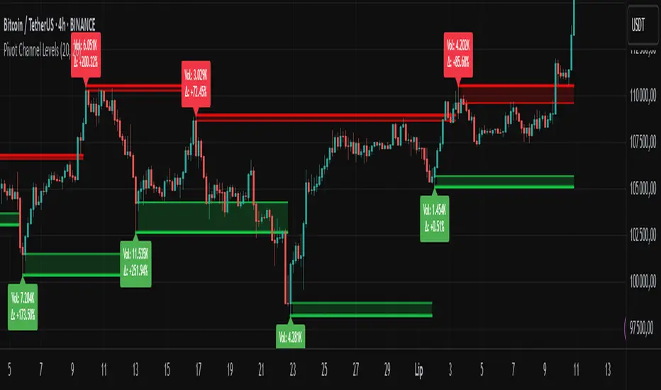 “Pivot Channel Levels” is an advanced technical analysis tool that identifies key price pivots (highs and lows) and creates dynamic support and resistance levels based on the wicks of candles at these points (or bodies if wicks are minimal). The indicator analyzes the volume at the time of a pivot’s formation, displaying its value and percentage change relative to the volume’s simple moving average (SMA).