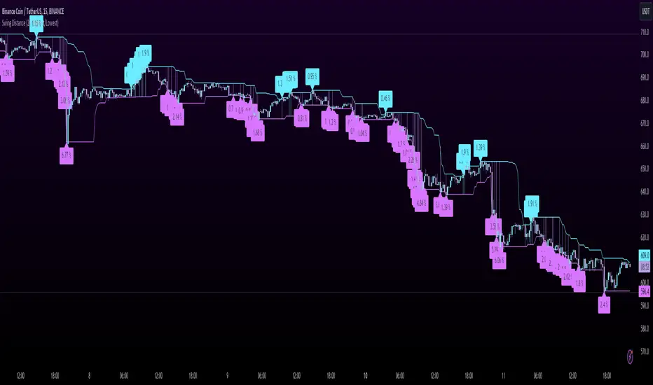 This simple indicator helps to visualize the distance between swings. It consists of two lines, the highest and the lowest line, which show the highest and lowest value of the set lookback, respectively. Additionally, it plots labels with the distance (in %) between the highest and the lowest line when there is a change in either the highest or the lowest value.