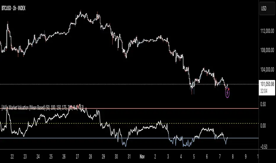 This indicator estimates whether price is overvalued, undervalued, or fairly valued relative to its structural mean across multiple lookback windows. It builds a single normalized oscillator from short-, mid-, and long-term ranges so traders can quickly see when price is stretched away from equilibrium.