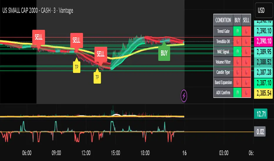 Description: This multi filter trading system integrates UT Bot, Waddah Attar Explosion (WAE), ADX, Trendillo, VIDYA blended T3, and Kalman SuperTrend logic. It generates BUY, SELL, and TP signals only when multiple adaptive trend, volume, and volatility conditions align.