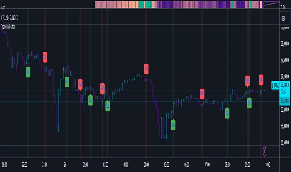 The Trend Indicator script is a custom oscillator-based tool designed for identifying potential entry and exit points in the market. Using a combination of Exponential Moving Average (EMA) and Relative Moving Average (RMA) calculations, it captures the trend direction and signals market momentum shifts. The indicator visually presents buy and sell signals and color-codes background conditions based on potential trend reversals, offering a clear and structured approach for trend-based trading strategies.