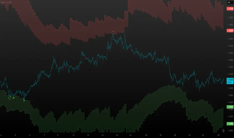 Large Arrows (Deep Red / Lime Green): Triggered when price touches the Outer (Extreme) band and rejects/closes back below the Inner band.