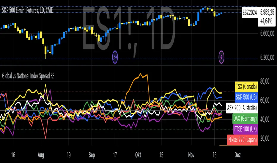 The Global vs National Index Spread RSI indicator visualizes the relative strength of national stock indices compared to a global benchmark (e.g., AMEX). It calculates the percentage spread between the closing prices of each national index and the global index, applying the Relative Strength Index (RSI) to each spread.