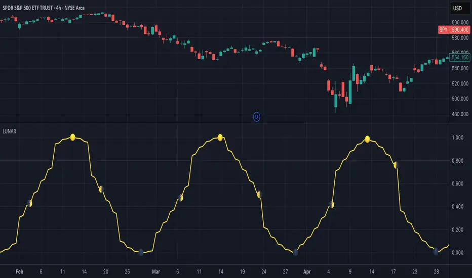 The Lunar Phase indicator is an astronomical calculator that provides precise values representing the current phase of the moon on any given date. Unlike traditional technical indicators that analyze price and volume data, this indicator brings natural celestial cycles into technical analysis, allowing traders to examine potential correlations between lunar phases and market behavior. The indicator outputs a normalized value from 0.0 (new moon) to 1.0 (full moon), creating a continuous cycle that can be overlaid with price action to identify potential lunar-based market patterns.