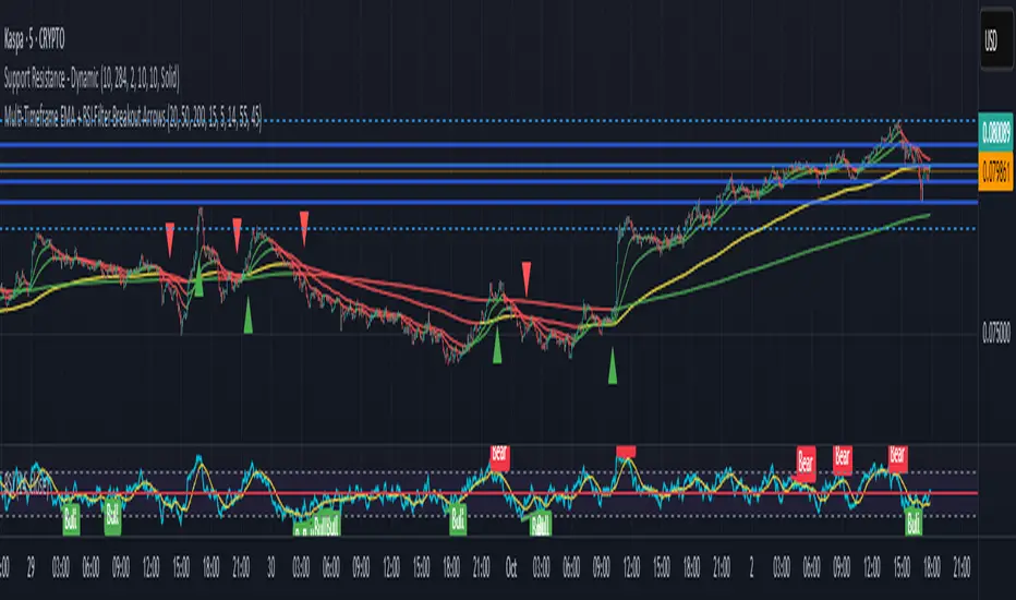 Multi-Timeframe EMA + RSI Filter Breakout Arrows