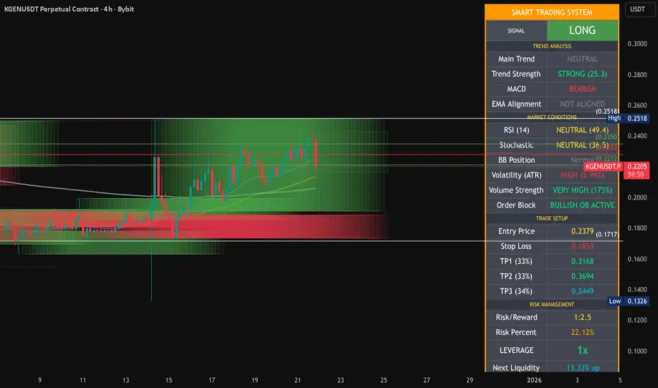 It combines Order Blocks, Liquidity Zones, EMA trend alignment, MACD, RSI, Volume, and ATR-based risk management to generate high-quality LONG / SHORT signals.
