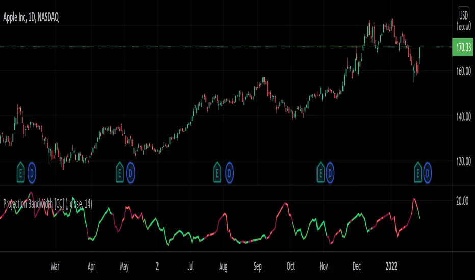 The Projection Bandwidth was created by Mel Widner (Stocks and Commodities Jul 1995) and this is another of my series of indicators that I consider undiscovered gems. For those of you who are unaware, the Bandwidth indicator measures the distance between the high and low bands and if you remember from my Projection Bands script, the Projection Bands give pretty accurate early signals of trend reversals and followed fairly closely by a large bulge in the bands. The large bulges in the bands essentially act as the confirmation that the trend reversal is happening and so that brings me to this indicator. This indicator gives signals based on if it has reached a peak or a valley. Both extremes mean that the current trend is ending and I have color coded it based on the buy and sell signals from my Projection Bands indicator. I have included strong buy and sell signals in addition to normal ones so strong signals are darker in color and normal signals are lighter in color. Buy when the line turns green and sell when it turns red.